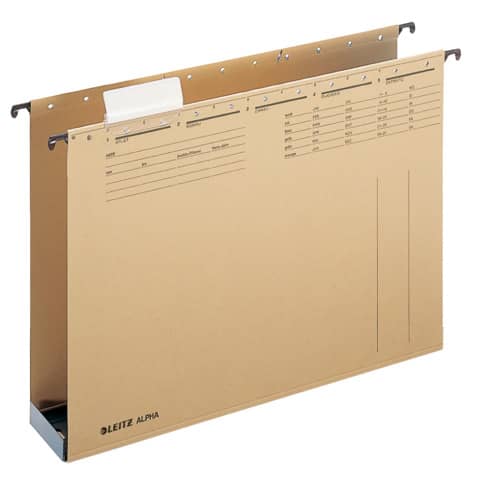 Hängesammler ALPHA®, seitlich offen, mit Kunststoffboden und Seitenbegrenzung. Für Loseblatt-Ablage von Einzelakten. Mit Schlitzstanzung für Einsteckheftstreifen (6130), Hängeschiene mit kunststoffumsinterten Hängenasen, Vollsichtreiter und Material:wechselbaren Blanko-Schildchen. Material: Natronkarton 320 g/qm (RC). Für A4. Boden: 60 mm. Farbe: naturbraun.