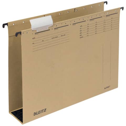 Hängesammler ALPHA®, seitlich offen, mit Hartpappeboden. Für Loseblatt-Ablage von Einzelakten. Mit Schlitzstanzung für Einsteckheftstreifen (6130), Hängeschiene mit kunststoffumsinterten Hängenasen, Vollsichtreiter und auswechselbaren Blanko-Schildchen. Material: Natronkarton 320 g/qm (RC). Für A4. Boden: 60 mm. Farbe: naturbraun.