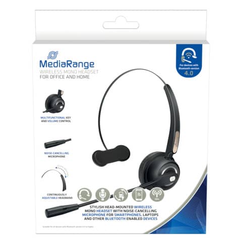 MediaRange PC Bluetooth Headsets eignen sich hervorragend für Telefonkonferenzen, Videokonferenzen oder zur Spracherkennung. Durch die Bluetooth Verbindung können Sie sich frei im Raum bewegen ohne das Ihnen ein Kabel im Weg hängt. Der flexible Mikrofonarm und die gepolsterte, frei rotier bare Ohrmuschel sorgen für einen bequemen Sitz und hohen Tragekomfort. Die MediaRange Headsets bieten Ihnen eine klare und deutliche Kommunikation bei Ihren Konferenzen. Das Rauschfilter Mikrofon sorgt weiterhin dafür, dass lästige Umgebungsgeräusche aus Ihrem Gespräch gefiltert werden. Durch den verstellbarer Kopfbügel passt sich das Headset jeder Kopfform perfekt an.Sie müssen das Headset nur über eine Bluetooth Verbindung an einem PC, Laptop oder Mobilgerät koppeln um es zu nutzten. Das Bedienelement des Headsets verfügt über vier Funktionen: Lauter, Leiser, Vorheriges Lied, Nächstes Lied.Der Multifunktionsknopf lässt Sie das Headset an, aus sowie Stummschalten stellen.