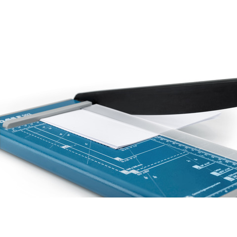 Hebel-Schneidemaschine Dahle 502. Art der Betätigung der Pressung: Handpressung. Ausstattung: Raster mit Formatgrößen vorhanden. Max. Papierformat: DIN A4 = 21,0 cm x 29,7 cm. Tragekomfort durch Griffmulden. Masse (Gewicht): 1,5 kg. Farbe: Blau. Material des Tisches: Metall. Tischgröße (B x T): 175 x 420 mm. Länge des Schnittes: 320 mm. Max. Stärke des Stapels je Schnittarbeitsgang: 0,8 mm. Max. Anzahl der Blätter (70g/qm) je Schneidearbeitsgang: 8 Blatt. Max. Anzahl der Blätter (80g/qm) je Schneidearbeitsgang: 6 Blatt.