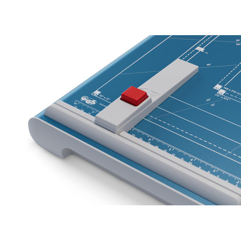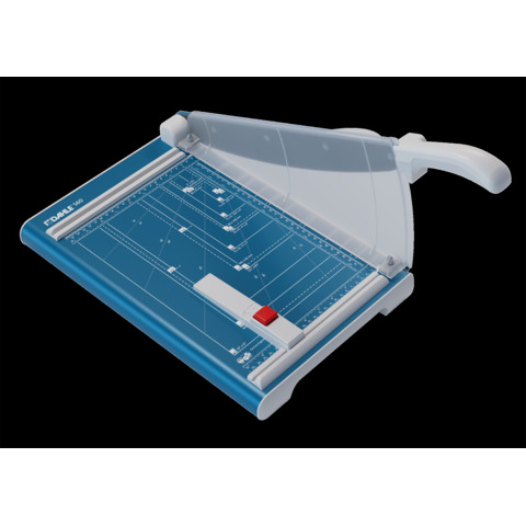 Hebel-Schneidemaschine Dahle 560. Ausführung der Sicherheitsausstattung: transparenter Messerschutz. Art der Betätigung der Pressung: Handpressung. Ausstattung: Rückanschlag verstellbar, Raster mit Formatgrößen vorhanden. Max. Papierformat: DIN A4 = 21,0 cm x 29,7 cm. Geschliffenes Ober- und Untermesser aus Solinger Messerstahl. Masse (Gewicht): 4,0 kg. Farbe: Blau. Material des Tisches: Metall. Tischgröße (B x T): 285 x 450 mm. Länge des Schnittes: 340 mm. Max. Stärke des Stapels je Schnittarbeitsgang: 2,5 mm. Max. Anzahl der Blätter (70g/qm) je Schneidearbeitsgang: 25 Blatt. Max. Anzahl der Blätter (80g/qm) je Schneidearbeitsgang: 20 Blatt.