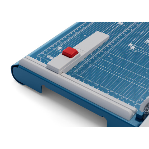 Hebel-Schneidemaschine Dahle 561. Ausführung der Sicherheitsausstattung: Sicherheitsautomatik. Art der Betätigung der Pressung: automatische Pressung. Ausstattung: Rückanschlag verstellbar, Raster mit Formatgrößen vorhanden. Max. Papierformat: DIN A4 = 21,0 cm x 29,7 cm. Geschliffenes Ober- und Untermesser aus Solinger Messerstahl. Masse (Gewicht): 6,1 kg. Farbe: Blau. Material des Tisches: Metall. Tischgröße (B x T): 265 x 440 mm. Länge des Schnittes: 360 mm. Max. Stärke des Stapels je Schnittarbeitsgang: 3,5 mm. Max. Anzahl der Blätter (70g/qm) je Schneidearbeitsgang: 35 Blatt. Max. Anzahl der Blätter (80g/qm) je Schneidearbeitsgang: 28 Blatt.