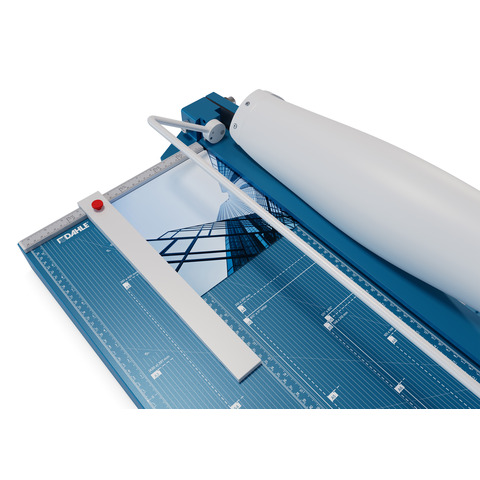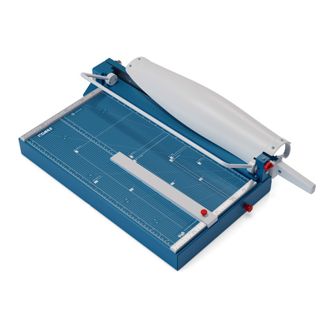 Hebel-Schneidemaschine Dahle 567. Ausführung der Sicherheitsausstattung: Sicherheitsautomatik. Art der Betätigung der Pressung: arretierbare Handpressung. Ausstattung: Rückanschlag verstellbar, Raster mit Formatgrößen vorhanden. Max. Papierformat: DIN A3 = 29,7 cm x 42,0 cm. Geschliffenes Ober- und Untermesser aus Solinger Messerstahl. Masse (Gewicht): 14,7 kg. Farbe: Blau. Material des Tisches: Metall. Tischgröße (B x T): 365 x 600 mm. Länge des Schnittes: 550 mm. Max. Stärke des Stapels je Schnittarbeitsgang: 3,5 mm. Max. Anzahl der Blätter (70g/qm) je Schneidearbeitsgang: 35 Blatt. Max. Anzahl der Blätter (80g/qm) je Schneidearbeitsgang: 28 Blatt.