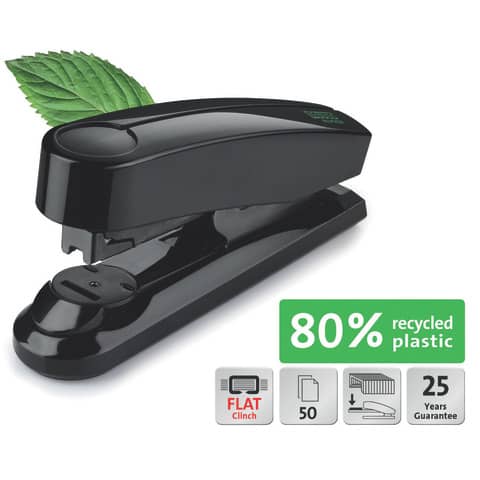 Nachhaltiges Flachheftgerät für den professionellen Tagesgebrauch, Vollmetallgerät mit glänzender Kunststoffummantelung aus nachhaltigem Rezyklat, Bewährtes System bei Flachheftgeräten für die offene und geschlossene Heftung sowie Möglichkeit zum Nageln, Lieferung inkl. 200 Klammern 24/6 DIN SUPER, heftet 50 Blatt, Einlegetiefe 60mm, 25 Jahre Garantie