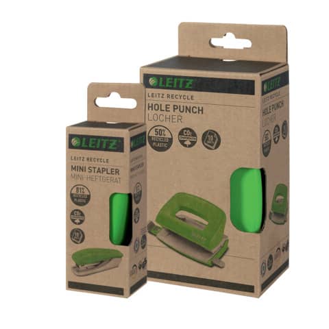 Leitz Mini Heftgerät NeXXt Recycle. Hergestellt aus 81% recyceltem Kunststoff, 100% recycelbar, da es mit Hilfe eines Schraubendreher vollständig in die verschiedenen Materialtypen zerlegt werden kann. Mit Oberlademechanik. Für geschlossene Heftung. Mit Tackerfunktion. Mit integriertem Entklammerer. Mit Direct Impact Technology (DIT) für perfektes und problemloses Heften. Kunststofffreie Verpackung aus 100% recyceltem Karton, vollständig recycelbar. Heftleistung: 1 mm/10 Blatt. Heftklammern: 100 x P2, Nr. 10. Einlegetiefe: 35 mm. Material: 81% recycelter Kunststoff, Metall. 3 Jahre Garantie nur bei Verwendung von Leitz Heftklammern, GS-geprüft. Farbe: grün.