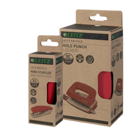 Leitz Mini Heftgerät NeXXt Recycle. Hergestellt aus 81% recyceltem Kunststoff, 100% recycelbar, da es mit Hilfe eines Schraubendreher vollständig in die verschiedenen Materialtypen zerlegt werden kann. Mit Oberlademechanik. Für geschlossene Heftung. Mit Tackerfunktion. Mit integriertem Entklammerer. Mit Direct Impact Technology (DIT) für perfektes und problemloses Heften. Kunststofffreie Verpackung aus 100% recyceltem Karton, vollständig recycelbar. Heftleistung: 1 mm/10 Blatt. Heftklammern: 100 x P2, Nr. 10. Einlegetiefe: 35 mm. Material: 81% recycelter Kunststoff, Metall. 3 Jahre Garantie nur bei Verwendung von Leitz Heftklammern, GS-geprüft. Farbe: rot.