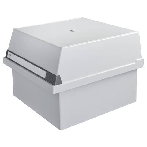 Karteikasten für ca. 1.300 Karten. Werkstoff: hochwertiger, schwermetallfreier Kunststoff. Das Unterteil kann platzsparend in den abnehmbaren Deckel gestellt werden, optimales Beschriftungsfeld, möbelschonende Kautschukfüßchen, inkl. 2 Stützplatten mit verschiebbarem Sichtreiter. Verwendung für Kartenformat: A4 quer. Größe (B x H x T): 320 x 242 x 365 mm. Farbe: lichtgrau.