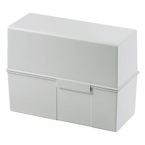 Karteibox DIN A5 quer, für max. 500 Karten. Der ideale Ordnungshelfer für Büro und unterwegs. Qualitativ hochwertige Ausführung mit Stahlscharnier sowie Schnappverschluss. Der Deckel lässt sich komplett umklappen und fungiert auch als zusätzlicher Karteitrog. Fassungsvermögen: von 330 Karten (190g/m²) bis max. 500 Karten (100g/m²). Lieferung ohne Inhalt. Verwendung für Kartenformat: DIN A5 quer. Zubehör optional: Register A-Z DIN A5, quer (Art.-Nr. 985). Außenmaße (B x T x H): 228 x 102 x 171 mm. Material: hochwertiger Kunststoff, Polystyrol (PS). Farbe: lichtgrau.