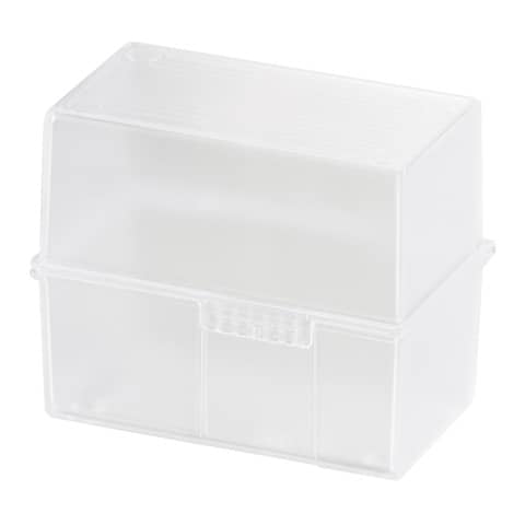Karteibox DIN A8. Werkstoff: hochwertiger, schwermetallfreier Kunststoff. Qualitativ hochwertige Ausführung mit Schnappverschluss und Stahlscharnier. Der ganz nach hinten umklappbare Deckel ist als zusätzliche Karteiablage verwenbar, 100 linierten Karteikarten (Art.-Nr. 981) und A-Z Register (Art.-Nr. 988) inklusive. Max. Anzahl der Karten: 200 Stück. Verwendung für Kartenformat: A8 quer. Größe (B x H x T): 69 x 71 x 58 mm. Farbe: transparent.