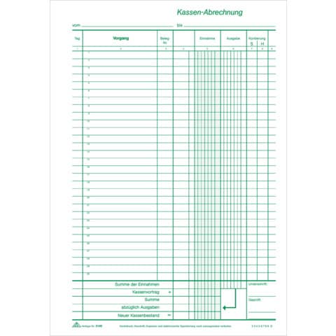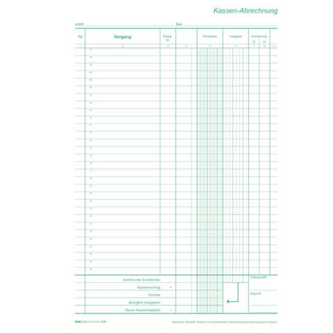 Im Kassenblock werden alle Kassenbewegungen (Einnahmen und Ausgaben) mit Vorgangsbezeichnung, Belegnummer, Betrag und Zuordnung der Buchung zu einem Buchungskonto (Kontierung) erfasst. Mit Seitenaufrechnung und Berechnung des neuen Kassenbestandes. Mit Nummerierung von 1/1 bis 50/50 und Beispielbuchungen. 1. Blatt weiß verbleibt im Block, 2. Blatt weiß perforiert.