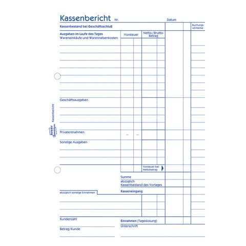 Recycling Kassenbericht. Anwendung: Buchhaltung, Abrechnen. Material: Papier. Detail: Recycling-Papier. Ausstattung mit: Ausfüllhilfe. Nachhaltigkeit: chlorfrei gebleicht, Blauer Engel, Recycling. Größe: A5. Geeignet zum Führen einer offenen Ladenkasse. Zur retrograden Ermittlung der Bareinnahmen. Mit dem "Blauen Engel" zertifiziert: aus 100% Altpapier. Mikroperforiert und alle Seiten gelocht. Von Rechtsexperten geprüft, mit praktischer Ausfüllhilfe.