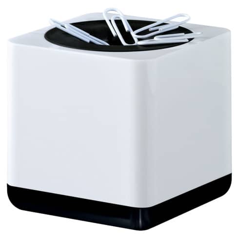 Klammernspender i-Line - ein elegantes, formschönes Accessoire mit großem Fassungsvermögen. Die hochglänzende Optik und klare Linienführung setzen moderne Akzente auf jedem Schreibtisch. Kompromisslose Qualität für moderne Bürowelten. Ein echter Blickfang. Durch den Ringmagneten sind die Büroklammern immer griffbereit und leicht zu entnehmen. Einfaches Nachfüllen durch entnehmbaren Magneten. Hochwertige, stabile und schwere Ausführung. Besonders möbelschonend durch einen vollflächigen, rutschfesten Schaumstoffboden. Design und Farbe sind abgestimmt auf alle Produkte der i-Line Serie. Made in Germany. Material: hochwertiger Kunststoff (ABS). Außenmaße: (B x T x H): 69 x 69 x 70 mm. Farbe: weiß-schwarz.