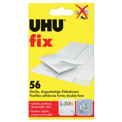 UHU® fix sind kräftige Klebekissen für schnelle, saubere und dauerhafte Verklebungen. Zum Fixieren und Kleben von Metall, Glas, Kunststoff, Textilien, Pappe, Papier u. v. m. Klebt sofort und dauerhaft. Belastbarkeit bis 300 g pro Klebekissen. Für Haushalt, Hobby und Büro. Größe: 12 x 18 mm (B x L).