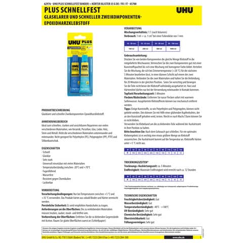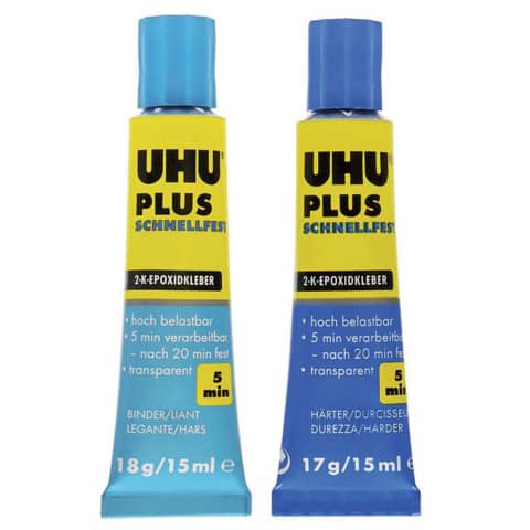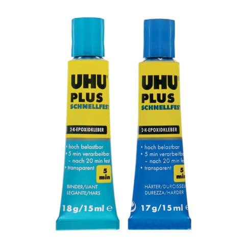 UHU® PLUS SCHNELLFEST. Ohne Lösungsmittel. 2-Komponenten-Epoxidharzkleber. Verarbeitungszeit: 5 min. Trocknungszeit: 20 min. Zugscherfestigkeit: 1900 N/cm². Klebeverbindung härtet transparent aus, ist schlagfest, beständig gegen Alterung und Feuchtigkeitseinwirkung. Produktverwendung: Metall, Stein, Beton, Glas, uvm.. Behälterart/-inhalt: Tube Binder 18 g, Tube Härter 17 g.