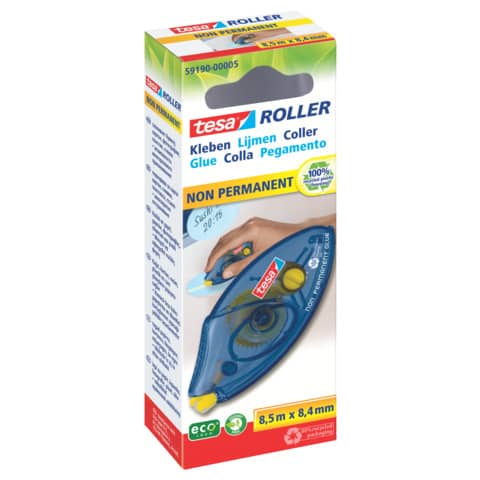 Der tesa® Einwegroller Kleben non permanent eco Logo® ist eine clevere Lösung für alle, die privat oder beruflich häufig etwas ankleben und später bequem wieder ablösen möchten. Die Kombination aus optimal dosierter tesa® Klebekraft und hoher Funktionalität machen aus dem praktischen Kleberoller einen unverzichtbaren Alltagshelfer. Der Einwegroller klebt sauber und schnell und eignet sich für Papier, Pappe, oder Fotos. Er wird z.B. eingesetzt, um eigene Haftnotizen zu machen oder aktuell wichtige Visitenkarten anzukleben. Das Gehäuse des Rollers ist transparent, so dass Sie immer wissen, wie viel Band sich noch in ihm befindet. Gelblicher Klebestreifen macht bereits aufgetragenen Kleber sichtbar. Einwegroller aus 100% recyceltem Kunststoff (Gehäuse). Verpackung aus 80% recyceltem Karton. Lösungsmittelfrei. Automatische Bandstraffung.
