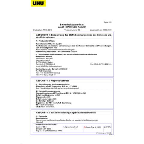 | Hersteller: | UHU GmbH & Co. KG, Herrmannstr. 7, 77815 Bühl, Deutschland, info@uhu.com |