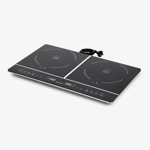 2 Glaskeramik-Kochfelder mit automatischer Topferkennung, schnelles Erhitzen durch gleichmäßige Wärmeverteilung und minimalem Energieverlust, die Hitze entsteht direkt im Topfboden, nicht auf der Kochplatte, kein Anbrennen auf dem Kochfeld, 180 Min. Timer mit Signalton und automatischer Abschaltung, beleuchtetes Display, Touch-Bedienfeld. 3.400 Watt, Maße B x H x T: 590 x 48 x 355 mm.