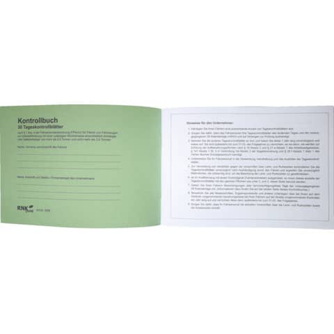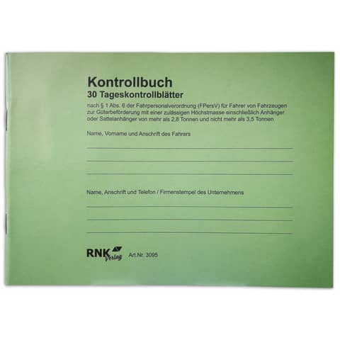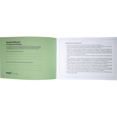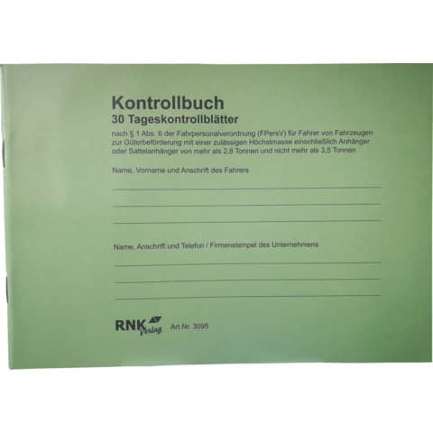 Nach der Fahrpersonalverordnung muss jeder Fahrer eines gewerblich genutzten Fahrzeuges mit mehr als 2,8 Tonnen bis maximal 3,5 Tonnen Höchstmasse inklusive Anhänger Aufzeichnungen über seine Lenk-, Arbeits- und Ruhezeiten führen. Mit dem Kontrollbuch werden diese gesetzlichen Anforderungen erfüllt. Der Umschlag ist einseitig glanzfolienkaschiert, strapazierfähig und schützt vor mechanischen Einflüssen, Fingerabdrücken oder Ähnlichem.