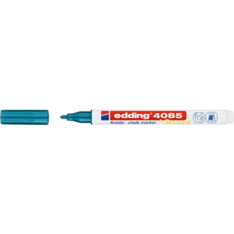 Kreidemarker 4085. Kreidemarker für die nicht-permanente Gestaltung, Dekoration und Beschriftung von geschlossenen Oberflächen, z. B. Fenster, dunkle Tafeln, Glas, plexiglas® und Spiegel. Gut deckende, geruchsneutrale Flüssigkreide auf Wasserbasis. Feucht abwischbar von fast allen geschlossenen Oberflächen. Rundspitze. Weißer Kunststoffschaft mit Kunststoffkappe in Schreibfarbe. Strichstärke: 1 - 2 mm. Schreibfarbe: blau-metallic.