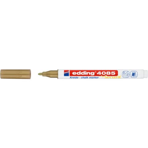 Kreidemarker 4085. Kreidemarker für die nicht-permanente Gestaltung, Dekoration und Beschriftung von geschlossenen Oberflächen, z. B. Fenster, dunkle Tafeln, Glas, plexiglas® und Spiegel. Gut deckende, geruchsneutrale Flüssigkreide auf Wasserbasis. Feucht abwischbar von fast allen geschlossenen Oberflächen. Rundspitze. Weißer Kunststoffschaft mit Kunststoffkappe in Schreibfarbe. Strichstärke: 1 - 2 mm. Schreibfarbe: gold.