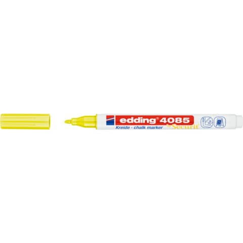 Kreidemarker 4085. Kreidemarker für die nicht-permanente Gestaltung, Dekoration und Beschriftung von geschlossenen Oberflächen, z. B. Fenster, dunkle Tafeln, Glas, plexiglas® und Spiegel. Gut deckende, geruchsneutrale Flüssigkreide auf Wasserbasis. Feucht abwischbar von fast allen geschlossenen Oberflächen. Rundspitze. Weißer Kunststoffschaft mit Kunststoffkappe in Schreibfarbe. Strichstärke: 1 - 2 mm. Schreibfarbe: neongelb.