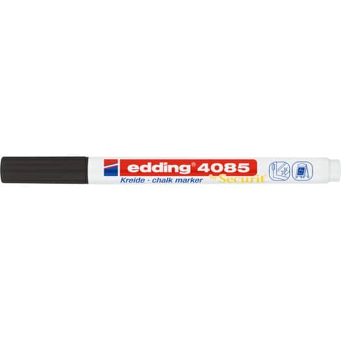 Kreidemarker 4085. Kreidemarker für die nicht-permanente Gestaltung, Dekoration und Beschriftung von geschlossenen Oberflächen, z. B. Fenster, dunkle Tafeln, Glas, plexiglas® und Spiegel. Gut deckende, geruchsneutrale Flüssigkreide auf Wasserbasis. Feucht abwischbar von fast allen geschlossenen Oberflächen. Rundspitze. Weißer Kunststoffschaft mit Kunststoffkappe in Schreibfarbe. Strichstärke: 1 - 2 mm. Schreibfarbe: schwarz.