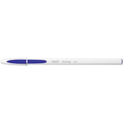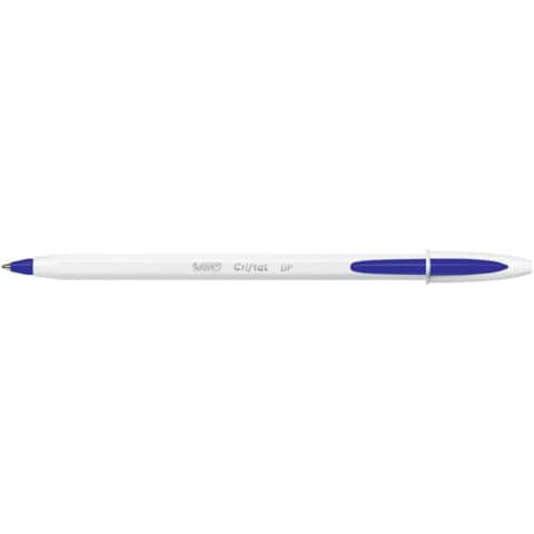 Kugelschreiber BIC® Cristal® Up. Kappenmodell. Ausführung Mine: 0,35 mm, blau, dokumentenecht. Ausführung Stift: Kunststoff. Ausführung Clip: Kunststoff, in Schreibfarbe. Hexagonaler Schaft, extrastarke Kugel aus Wolframkarbid. Farbe des Schaftes: weiß.