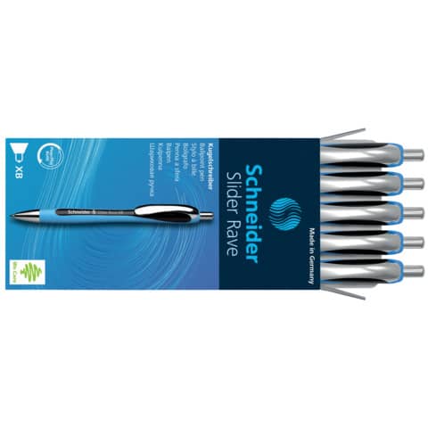 Kugelschreiber Slider Rave. Druckmechanik. Typbezeichnung der Mine: Slider 755 (ISO-Format G2) mit verschleißfester Edelstahlspitze. Ausführung Mine: XB, schwarz, dokumentenecht, Mine auswechselbar. Ausführung Stift: Kunststoff, gummierte Oberfläche. Clip: Metall, silber. Ergonomische Form. Viscoglide®-Technologie für außergewöhnlich weiches und gleitendes Schreiben. Schneider Kugelschreiber und Minen mit dem Plug+Play-Symbol sind untereinander kompatibel. Das macht den Minenwechsel spielend einfach. Farbe des Schaftes: cyan/schwarz.