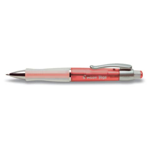 Kugelschreiber Véga mit Druckmechanik und Mine M (2123) auswechselbar. Schreibfarbe schwarz. Gehäuse und Clip aus Kunststoff. Ergonomische und gummierte Griffzone für angenehmes Schreiben. Farbe des Gehäuses rot-transluzent mit Clip in Gehäusefarbe.
