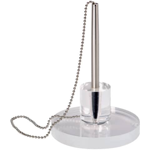 Für Schalter und Büros mit Publikumsverkehr, in Banken und Behörden. Sicherer Stand. Dokumentenechte Mine. Schwerer Fuß aus hochwertigem Acryl für sicheren Stand. Edler Kugelschreiber aus Edelstahl und Kunststoff an starker Kugelkette. Transparente Standnoppen. Starke Kugelkette, Länge 42 cm. Ø 11 cm, Höhe 16,5 cm.