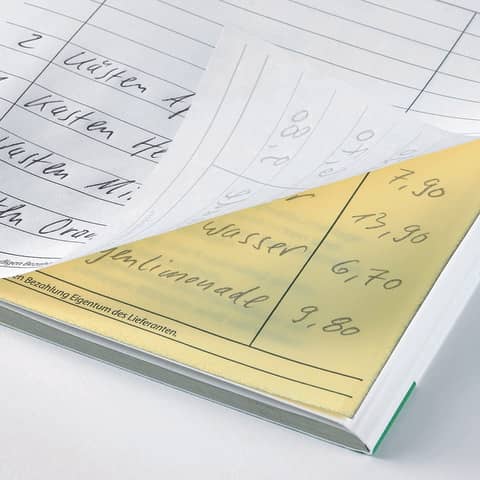 Selbstdurchschreibender Lieferschein, Format A6, mit Empfangsschein. Jedes Blatt mit Abheftlochung und ultra-feiner Microperforation für leichtes und sauberes Abtrennen. Formularbuch mit besonders haltbarer Spezial-Rückenleimung und integrierter Schreibunterlage zum Einklappen.