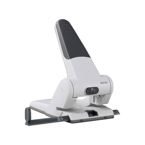 Extrastarker Registraturlocher mit Anschlagschiene aus Kunststoff, auch für A3. Arretierbarer Hebel zur platzsparenden Aufbewahrung. Stanzleistung/Blatt: 6,5 mm/65. Material: Aluminium-Druckguss mit Kunststoffboden. Farbe: silber.