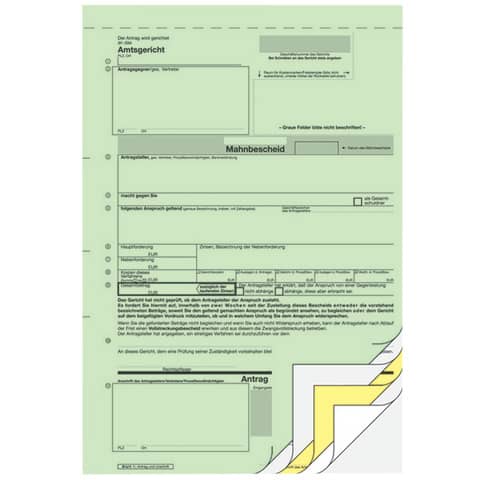 Der Mahnbescheid für das maschinelle Mahnverfahren ist ein amtlicher Vordruck und ist von allen deutschen Mahngerichten anerkannt, er ist in jedem Bundesland gültig. Selbstdurchschreibendes Formular in neutraler Fassung, mit Durchschrift für den Antragsteller.