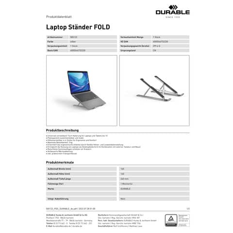 Weiterführende Links zu "Notebookständer Alu bis 15Zoll met.silbe DURABLE 5051 23 FOLD"