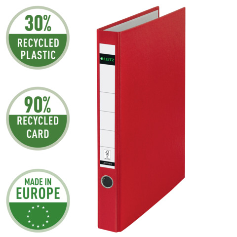 Ringordner, ohne Schlitze. Mechanik: 2-Ring-Reißmechanik, und Blattniederhalter. Ringdurchmesser: 20 mm, Füllhöhe: 15 mm, Rückenbreite: 35 mm. Material: Einband aus Pappe (RC), außen mit Polypropylen kaschiert, innen hellgraues PE-beschichtetes Papier. Format: 318 x 285 mm, für A4. Farbe: rot.