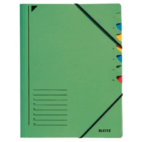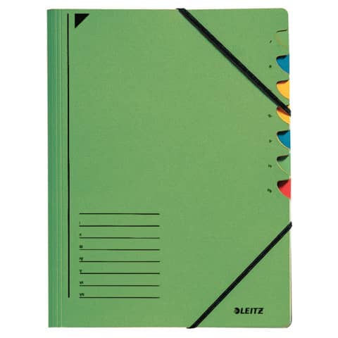 Leitz Ordnungsmappe mit 7 Fächern. Einband aus hochwertigem 430 g/qm zu 100 % recyceltem Pendarec-Karton. Fächerblock aus 350 g/qm Pendarec-Karton. Fächer mit fünffarbigen Greifausschnitten. Gummiband über Vorderdeckelecken. Blauer Engel. Größe: 245 x 320 mm (B x H).
