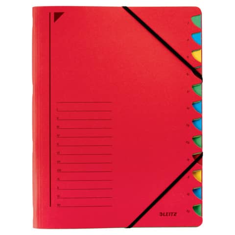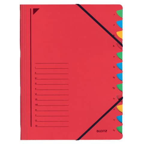 Leitz Ordnungsmappe mit 12 Fächern. Einband aus hochwertigem 430 g/qm zu 100 % recyceltem Pendarec-Karton. Fächerblock aus 350 g/qm Pendarec-Karton. Fächer mit fünffarbigen Greifausschnitten. Gummiband über Vorderdeckelecken. Blauer Engel. Größe: 245 x 320 mm (B x H).