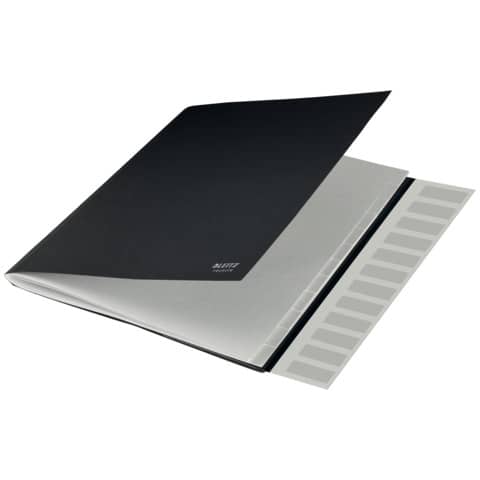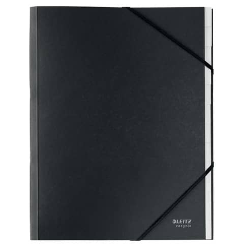 Leitz Ordnungsmappe Recycle. 12 Fächer. Hergestellt aus zu 100% recyceltem Karton und zu 100% recycelbar (nach Entfernen der Gummizüge). Mit Inhaltsverzeichnis auf der Klappe des Rückdeckels innen. Mit elastischen Gummizügen über den Ecken des Vorderdeckels. Kein Verpackungsabfall, Kennzeichnung nur mittels Etikett. Material: Einband: 100% recycelter Karton 430 g/qm (RC), Fächerblock: 100% recycelter Karton 275 g/qm (RC). Format: für DIN A4, 247 x 320 x 20 mm. Farbe: schwarz.