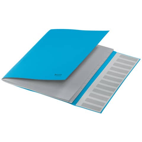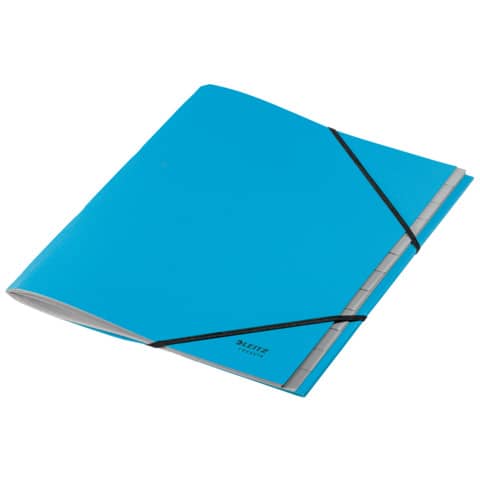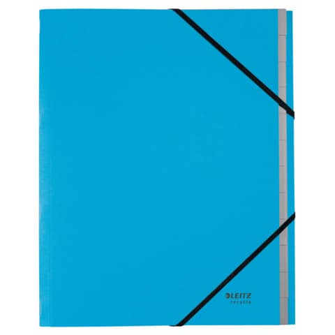 Leitz Ordnungsmappe Recycle. 12 Fächer. Hergestellt aus zu 100% recyceltem Karton und zu 100% recycelbar (nach Entfernen der Gummizüge). Mit Inhaltsverzeichnis auf der Klappe des Rückdeckels innen. Mit elastischen Gummizügen über den Ecken des Vorderdeckels. Kein Verpackungsabfall, Kennzeichnung nur mittels Etikett. Material: Einband: 100% recycelter Karton 430 g/qm (RC), Fächerblock: 100% recycelter Karton 275 g/qm (RC). Format: für DIN A4, 247 x 320 x 20 mm. Farbe: blau.