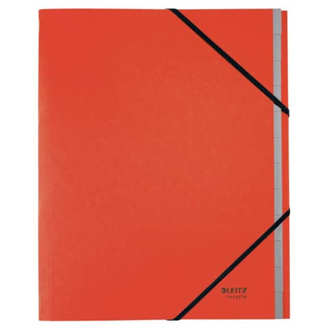 Leitz Ordnungsmappe Recycle. 12 Fächer. Hergestellt aus zu 100% recyceltem Karton und zu 100% recycelbar (nach Entfernen der Gummizüge). Mit Inhaltsverzeichnis auf der Klappe des Rückdeckels innen. Mit elastischen Gummizügen über den Ecken des Vorderdeckels. Kein Verpackungsabfall, Kennzeichnung nur mittels Etikett. Material: Einband: 100% recycelter Karton 430 g/qm (RC), Fächerblock: 100% recycelter Karton 275 g/qm (RC). Format: für DIN A4, 247 x 320 x 20 mm. Farbe: rot.