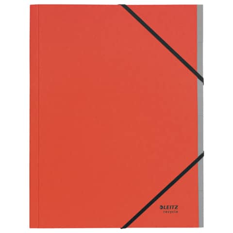 Leitz Ordnungsmappe Recycle. 6 Fächer. Hergestellt aus zu 100% recyceltem Karton und zu 100% recycelbar (nach Entfernen der Gummizüge). Mit Inhaltsverzeichnis auf der Klappe des Rückdeckels innen. Mit elastischen Gummizügen über den Ecken des Vorderdeckels. Kein Verpackungsabfall, Kennzeichnung nur mittels Etikett. Material: Einband: 100% recycelter Karton 430 g/qm (RC), Fächerblock: 100% recycelter Karton 275 g/qm (RC). Format: für DIN A4, 245 x 320 x 20 mm. Farbe: rot.