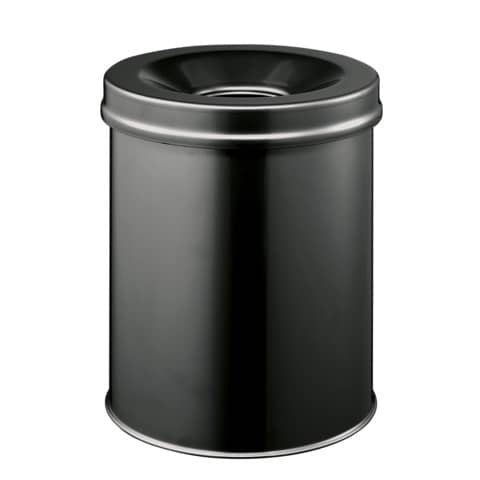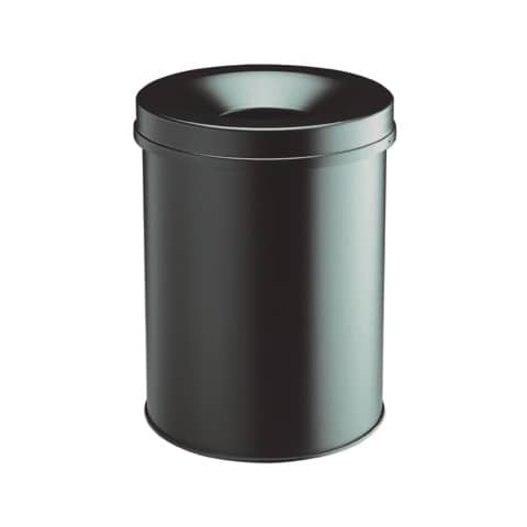 Papierkorb SAFE rund 15. Material und Form: Stahl mit kratzfester Epoxidharzbeschichtung, rund. Anzahl der Sortierfächer: 1. Ausstattung: Deckel vorhanden. Der selbstlöschende Deckel unterbricht die Sauerstoffzufuhr im Papierkorb und erstickt die Flammen rechtzeitig. Sicherheitsausstattung: flammsicher, Flammenlöschkopf. Durchmesser min/max: 260 mm. Höhe: 357 mm. Volumen: 15 l. Farbe: schwarz.