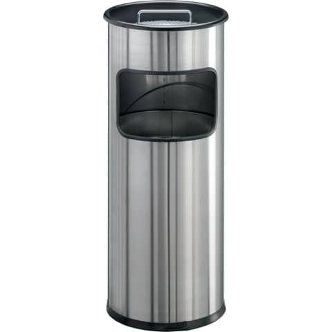 Papierkorb mit Ascher EDELSTAHL rund. Material und Form: gebürsteter Edelstahl, rund. Ausstattung: Ascher und Griffrand vorhanden. Werkstoff Ascher: Außenkörper Edelstahl, Inneneinsatz Stahl. Für den Innen- oder geschützten Außenbereich geeignet. Herausnehmbarer Innen- und Drahteinsatz für eine einfache Reinigung. Mit rutschfestem Boden zum Schutz des Fußbodens. Umweltfreundliches Material (aus mindestens 50% recyceltem Material (Post Consumer Abfall) und zu 100 % recycelbar). Inklusive 1,5 kg Sandfüllung für den Ascher. Größe (Ø x H): 260 x 620 mm. Volumen Papierkorb: 17 l. Volumen Ascher: 2 l. Farbe: metallic silber.
