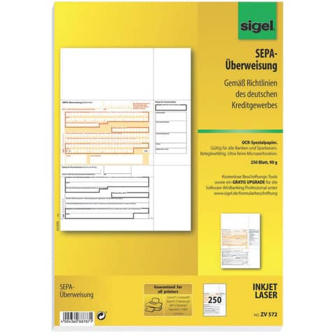 Produktinformationen "PC-Formular Sepa-Überweisung SIGEL ZV572 A4 250BL 90g"