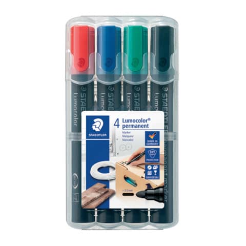 Permanentmarker Lumocolor®. Nachfüllbar. Art der Schreibflüssigkeit: geruchsarme Tinte, xylol- und toluolfrei, wasserfest, lichtbeständig gegeben. Kann einige Tage offen liegen bleiben, ohne einzutrocknen. Ausführung der Spitze: Rundspitze. Efficient for ecology: blockierte Spitze, Schaft und Kappe aus PP garantieren lange Lebensdauer, einfaches Nachfüllen mit Tankstelle 488 50. Für fast alle Flächen. Sekundenschnell trocken, daher ideal für Linkshänder. Material des Schaftes: PP. Kappe umsteckbar. Clip vorhanden. Farbe des Schaftes: schwarz. Strichstärke: ca. 2 mm. Schreibfarbe von Schreibgeräten: 2 rot, 3 blau, 5 grün, 9 schwarz. Ausführung des Inhalts mit Packung: STAEDTLER Box mit 4 Farben.