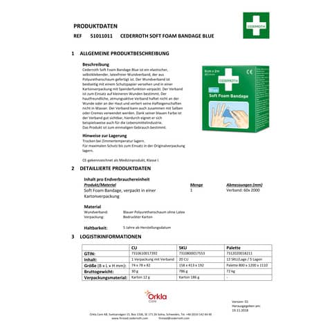 | Hersteller: | Orkla Wound Care AB, Cederroth, Box 1336, Svetsarvägen 15 SE-171 26 Solna Sweden, firstaid@cederroth.com |