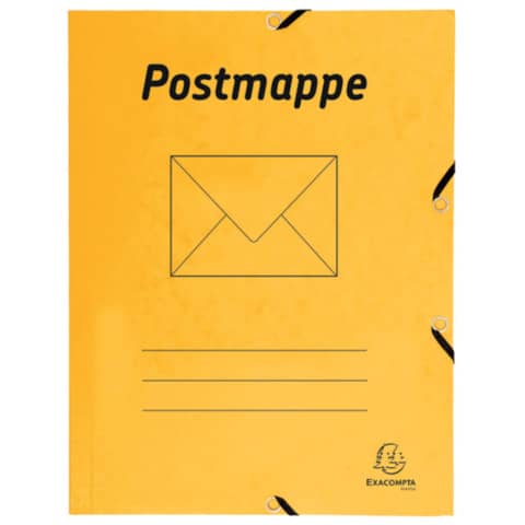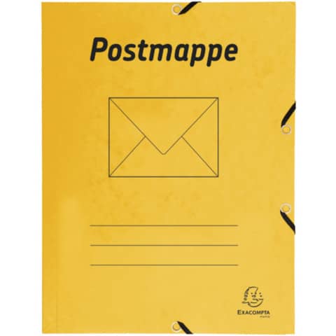 Postmappe A4 aus Colorspan-Karton Postmappe aus starkem Colorspan-Karton 425g/qm mit 3 Klappen und Gummizug für einen sicheren Verschluss der Unterlagen. Mit Aufdruck Postmappe sowie Beschriftungslinien auf dem Deckel. In typischem Gelb, für Briefzustellungen im Unternehmen oder auch für Unterlagen in der Schule. Größe (B x H): 24x32 cm für Format DIN A4.