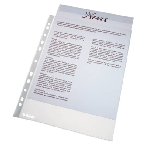 Prospekthülle Economy, oben offen, mit verstärktem Lochrand, dokumentenecht, genarbt, mit Universallochung. Material: Polypropylen (PP), 0,05 mm. Format: für A4. Inhalt: 100 Stück. Farbe: farblos.