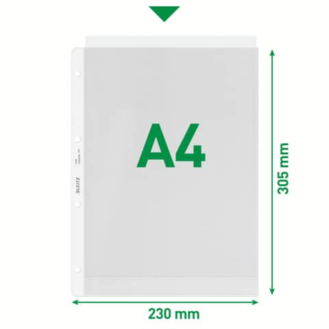 Prospekthülle Premium, oben offen, stabil und reissfest, genarbt, mit 4-fach Lochung. Material: Polypropylen (PP), 0,13 mm. Format: für A4. Farbe: farblos.