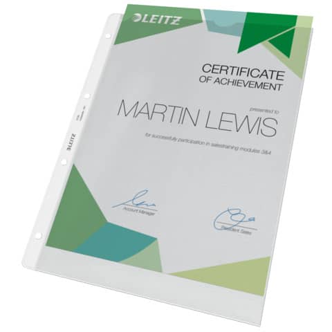 Prospekthülle Premium, oben offen, mit Papiereinlage, Einreißschutz und Daumenausschnitt, stabil und reissfest, dokumentenecht, genarbt, mit 4-fach Lochung. Material: Polypropylen (PP), 0,13 mm. Format: für A4. Farbe: farblos.